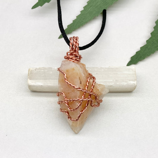 Pink Calcite Necklace, Copper Wrapped Raw Stone
